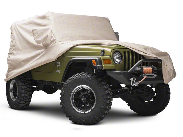 Latest Fabric Technology. The Taupe Covercraft Deluxe Custom-Fit Car Cover shields your 1997-2006 Wrangler TJ from the outdoor elements. The sun's ultraviolet rays can cause paint and upholstery to fade. Wind can pelt your truck's exterior with sand and other debris, while rain, frost, hail, and snow can wreak their own havoc. A protective film barrier is sandwiched between the outer and inner layers of spunbound fabric to wrap your Jeep in the ultimate in car care.