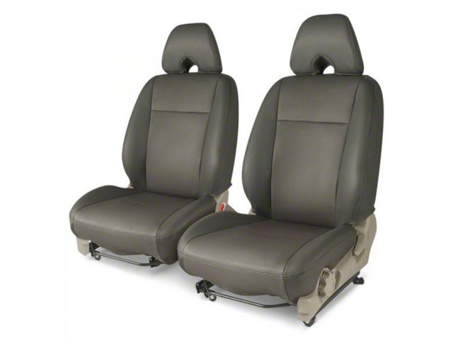 Construction and Features. Crafted from high-quality leatherette vinyl, these seat covers offer the look and feel of leather while providing excellent durability and easy maintenance. The stone gray finish adds a sophisticated touch to your interior, enhancing both style and protection. Designed for a custom fit, these covers ensure a snug and secure installation on your front seats.