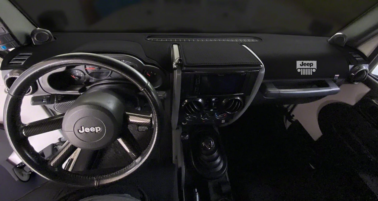 Construction and Appearance. Made from warp-knit polyester fabric, this dash cover is soft yet durable, resistant to fading, and expertly crafted for long-lasting performance. The sleek smoke black finish adds a refined look, while the Jeep Grille logo provides a signature touch. The material also helps insulate the dash while allowing sound to travel unobstructed through covered speakers.