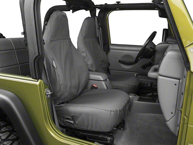 Powerful Seat Protectors. Protect your Wrangler’s front seats in style with these Covercraft Seat Saver Front Row Seat Covers. These charcoal gray seat protectors add a smooth look to your interior while protecting your leather or fabric seats from dust, dirt, and damage.