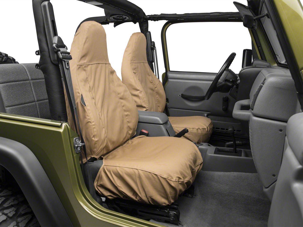 Custom-Fit Protection. When you're ripping up the trail in your 1997-2006 Jeep Wrangler TJ, one of the last things you're thinking of could be how much you're putting your interior through. So do your front seat a favor and pick up the Covercraft Seat Saver Front Row Seat Covers - Tan. It's a custom fit for your Jeep to provide protection from spills, dirt, and debris.
