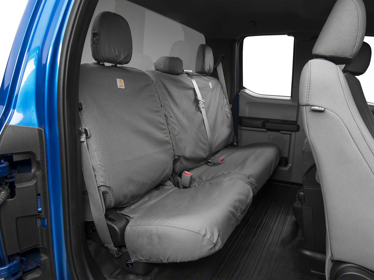 High-Quality Construction. Made of premium, duck-weave Carhartt fabric, these Second Row Seat Covers can withstand prolonged exposure to harsh elements and reliably protect the factory seat underneath. Each piece features triple-stitched seams and sewn-in elastic tension straps for durability and secure fit. Moreover, the breathable and water-resistant material is designed to bead away any moisture, spills, or sweat.