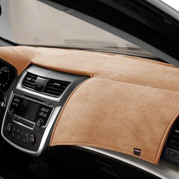 Construction and Appearance. Crafted from high-quality velour material, the Covercraft VelourMat Dash Cover offers a soft and luxurious feel while ensuring durability. The Caramel black finish adds a sleek look to your vehicle's interior. This dash cover is designed to cover existing blemishes, cracks, and other damage, giving your dashboard a refreshed appearance without muffling the speakers.