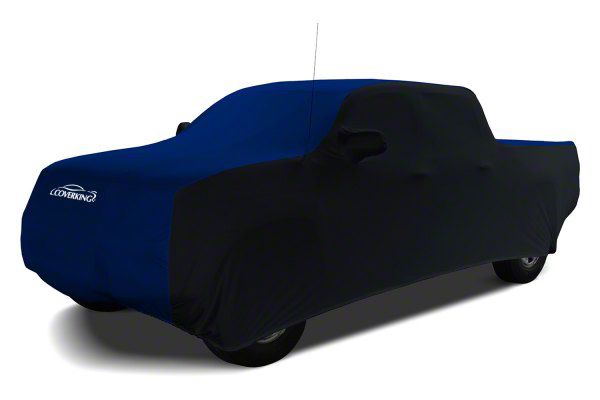 Description. Car Cover; Custom Vehicle Cover Satin Stretch; 2-Tone Black Sides Impact Blue Center