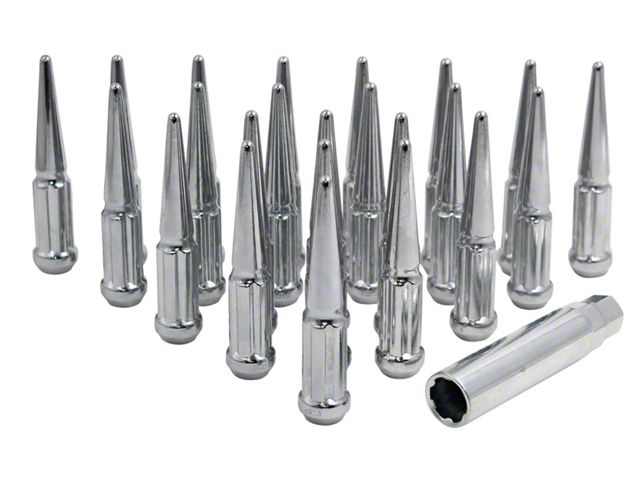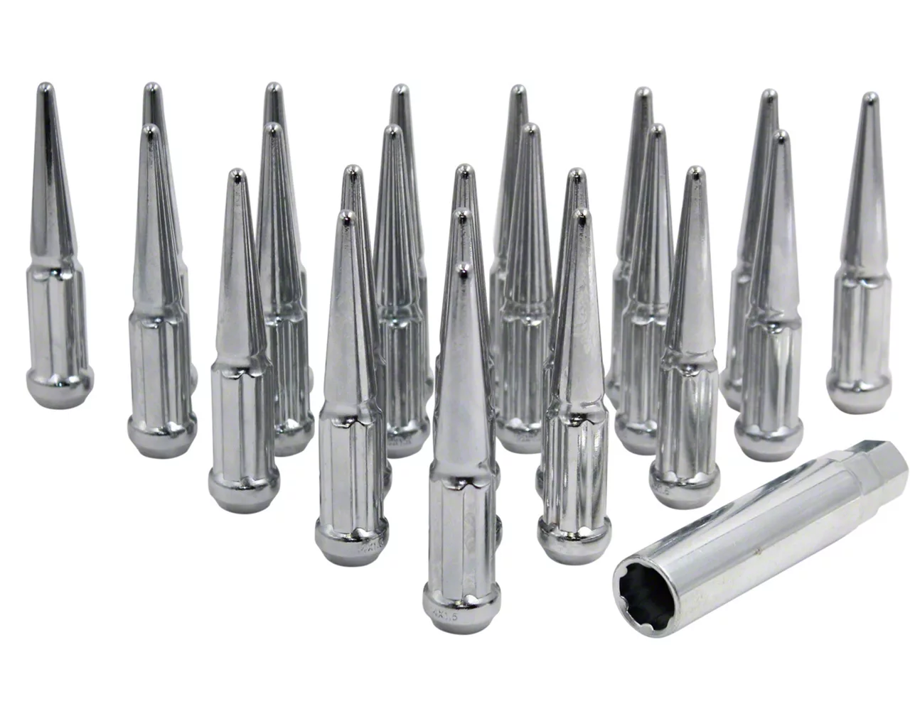 Hardcore Steel. You take on serious challenges every time you get behind the wheel, from demanding conditions to rigorous terrains to serious off-road abuse. To ensure your new Spike 5-lug nut kit has the strength necessary to maintain its reliable performance in these conditions, it contains lug nuts made from heavy-duty steel that are finished with a protective and eye-catching chrome finish. Guaranteed to give your rig a boost, these 24 lug nuts are also perfectly tailored to fit your 5-lug wheels with 12 mm x 1.50 thread and a 1.90 inch length.