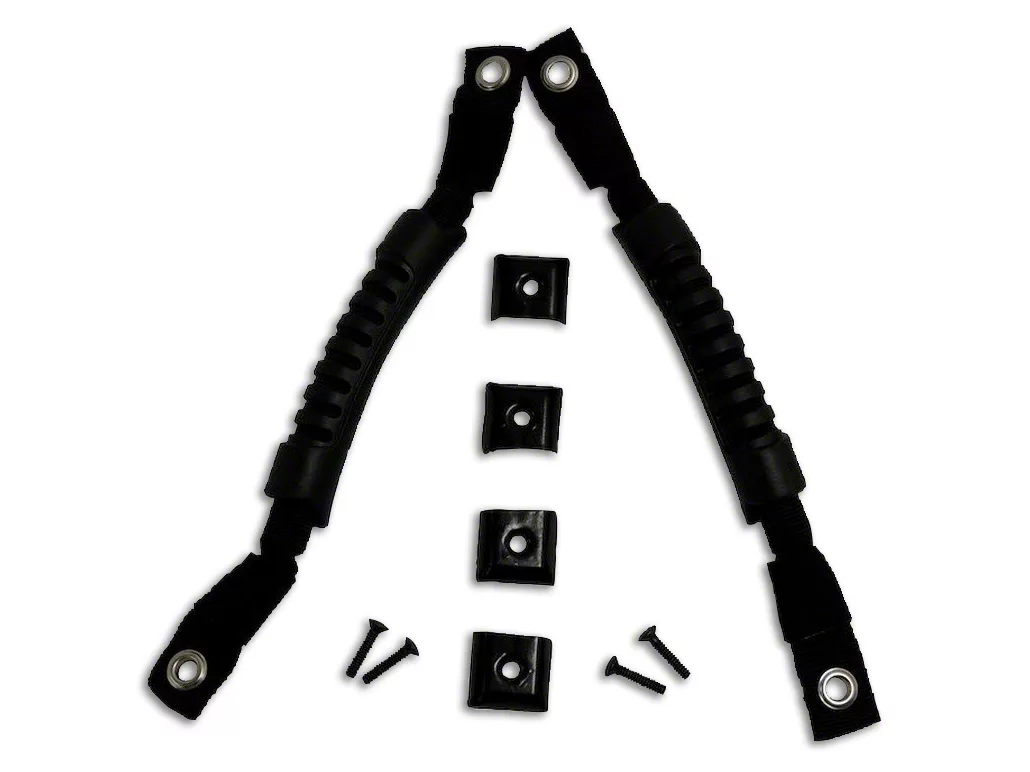Secure Your Person. These grab handles allow for the very best in support and stabilization all made possible by a tough nylon webbing construction. The handles mount to your Jeep's rear sports bar or sound bar via 3 hook and loop, adjustable straps configuration. Also featured are molded rubber sure grip handles for that tight hand hold needed to secure your person.