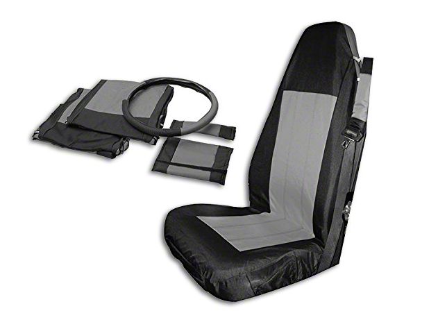 Cover it Up. Whether you drive with the top down for most of the year, or have a hardtop, seat covers are great way to protect your Wrangler’s seats from wearing out quickly. These Front Seat Covers - Black/Gray are a great choice as they are made from a durable canvas that can withstand the elements and the sun. These covers come in a sporty black and gray color to match almost any interior scheme.
