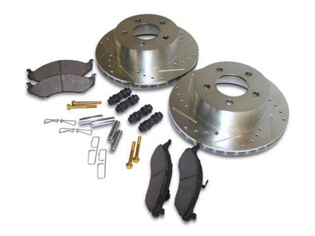 Stopped in Your Tracks. Running up rock walls and bouncing around pitted trails is why your 1990-2006 Jeep Wrangler was made. But there are times when you really need to put the brakes on your Wrangler movement, literally. And if you need a braking system with performance that second-to-none, then you need the Performance Drilled and Slotted Brake Rotor and Pad Kit - Front. With durable construction and innovative design, these brakes will stop you dead in your tracks.
