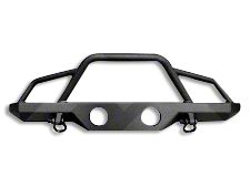 Reliable Off-Road Companion. This Recovery Front Bumper literally offers you that adventurous ride on a silver platter. This 66.5 inch x 20.5 inch x 13 inch bumper comes with a 3/16-inch steel plate that features tubular steel construction that guarantees optimal performance on any terrain of your choice. The 69.5-pound Recovery Front Bumper is a direct fit over your factory plastic bumper, offering your Wrangler that unique muscle car look. This appearance is further complemented with the black powder coat external finishing.