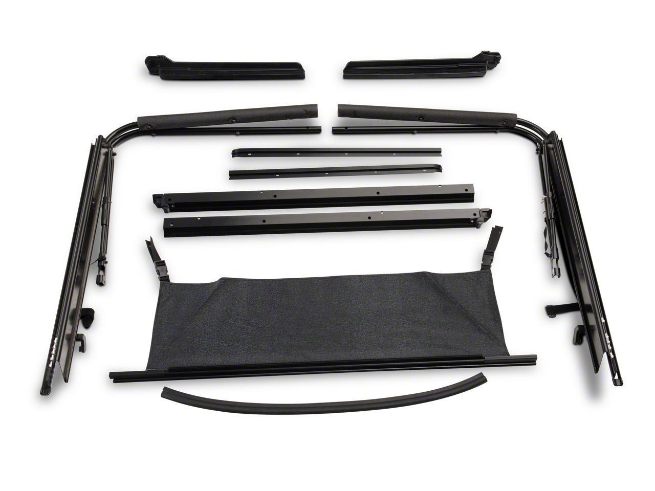 Replacement Hardware Kit. This Soft Top Hardware Kit includes factory-style replacement parts for damaged or missing components of your Wrangler's soft top. Kit consists of Tailgate Bar, Adjustable Spreader Bars and Upper Windshield Inserts. Does Not Include Door Frames, Surround Base or Rails for 1/2 Steel Doors.