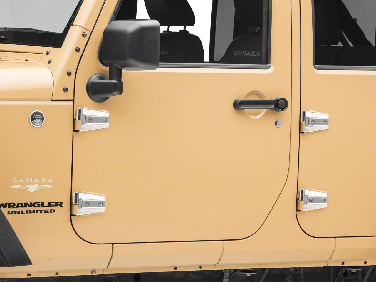 A Touch Of Class And Style. Whether you are replacing old, worn out door hinges or simply looking to add to the beauty of your 4-Door Jeep Wrangler JK, the Stainless Door Hinge Kit is the perfect fit. With these 4 complete door treatments, including 4 upper and 4 lower hinges, you can give your ride an all-around polished look and feel.