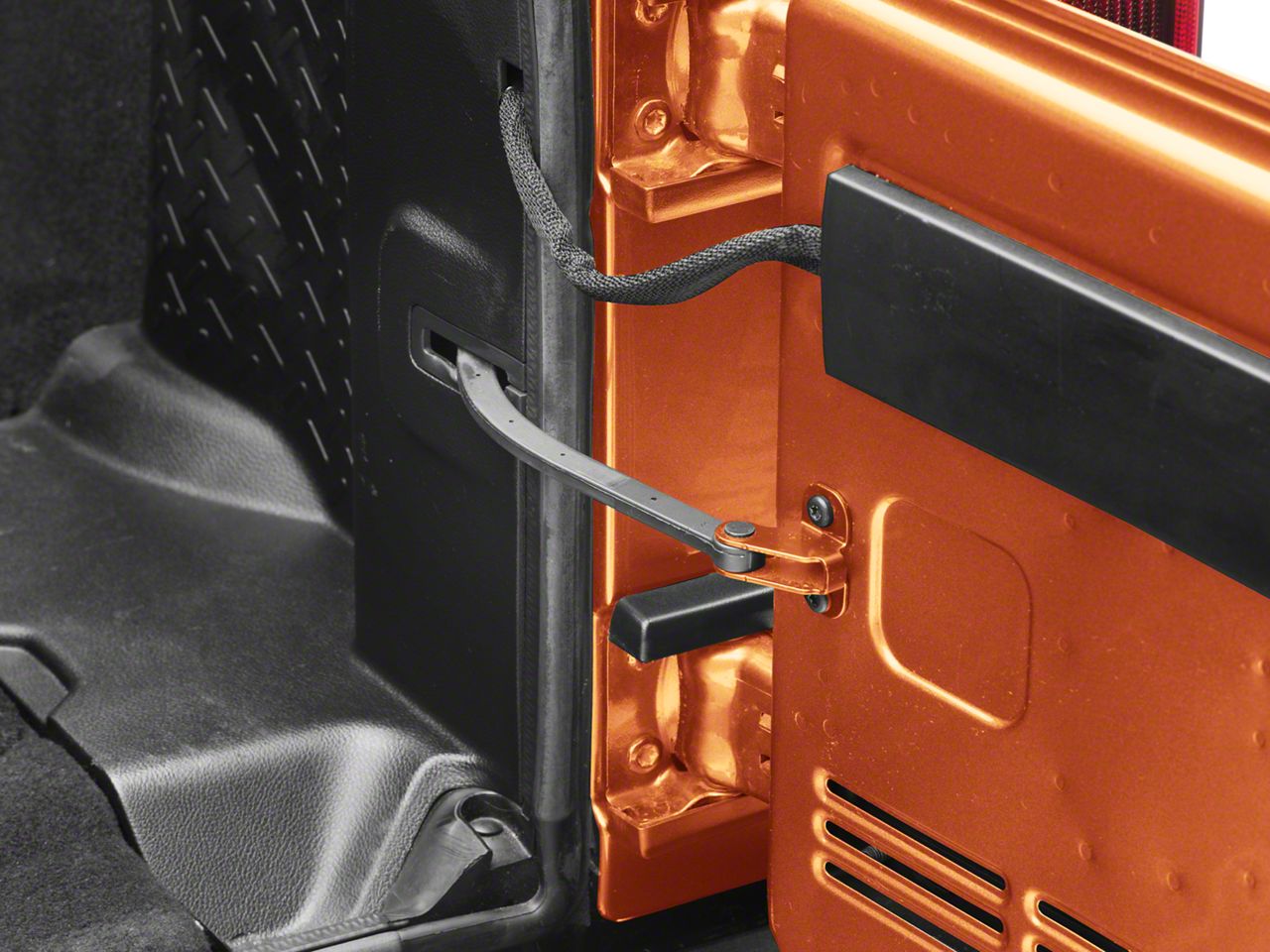 Picnic Perfect. This Tailgate Check keeps the tailgate of your 2011-2018 Wrangler JK from slamming into the body and damaging the paint. It also provides a handy surface for laying out tailgate picnics. The stock tailgate check on the Wrangler is notoriously flimsy, so you may want to upgrade before your tailgate dings your body work, or you spill all your beer, Buffalo wings, and potato salad all over the ground.