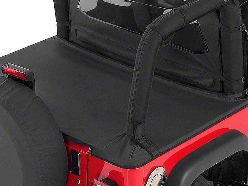 Protects Your Stuff With Elegance. Decked in sleek black denim, this Tonneau Cover in black denim is like having a professional body guard protecting the rear of your Wrangler and your belongings from prying eyes, windblown crap, and foul weather. Unless it's your intention to collect insects, pine cones, and dust/sand samples, shield your truck with style.