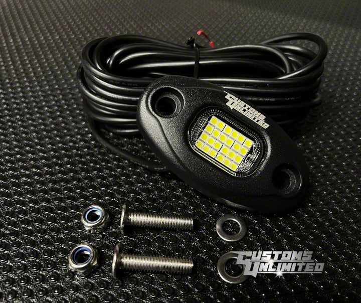 High-Intensity Rock Light for Superior Off-Road Visibility. The Customs Unlimited Rock Light-Pod offers pure white light output, delivering up to 2,400 lumens of illumination for enhanced visibility in off-road conditions. Designed for universal fitment, this high-intensity light pod is up to 6 times brighter than industry standards, making it an ideal choice for improving nighttime off-road adventures.