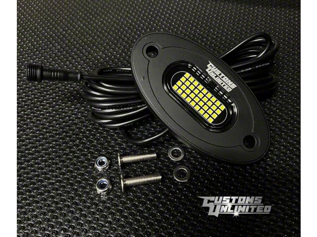High-Performance Brightness. The Customs Unlimited Pure White 36-LED Plug and Play Extreme Brightness Rock Light Kit provides exceptional illumination for your vehicle, producing up to 3,100 lumens. Designed for off-road enthusiasts, this kit is perfect for enhancing visibility under your vehicle or highlighting specific areas, all with an easy plug-and-play setup.