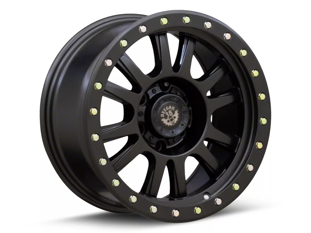 Deegan 38 by Mammoth Ghost Rider Series Wheel. The Deegan 38 by Mammoth Ghost Rider Series Wheel features a bold twelve spoke design with a faux beadlock ring that features zinc plated hardware. This Deegan 38 by Mammoth Wheel is perfectly suited for both on and off-road applications. A Deegan 38 center cap with gold emblem is included.