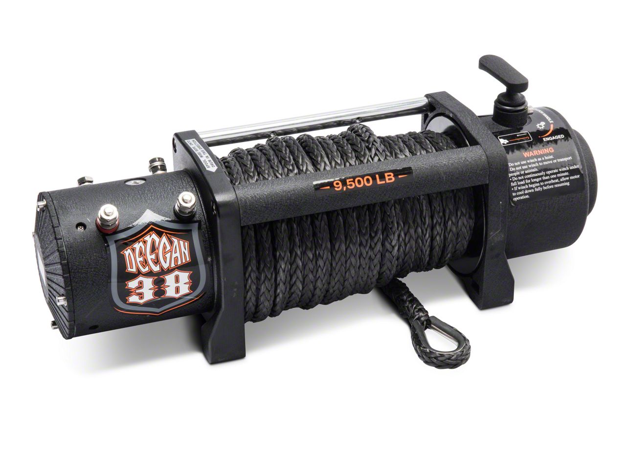 Heavy-Duty 9,500 Pound Winch. Driven by a powerful, 5.5 HP series-wound, 12-volt electric motor, this Deegan 38 Winch features a rugged, 3-stage planetary gear box with a 195.4:1 gear ratio, to provide 9,500 pounds of pulling power. Matched with a sliding ring gear clutch and a 2-way automatic, in-the-drum braking system, you know you can always rely on this Deegan 38 Winch to get you out of trouble.
