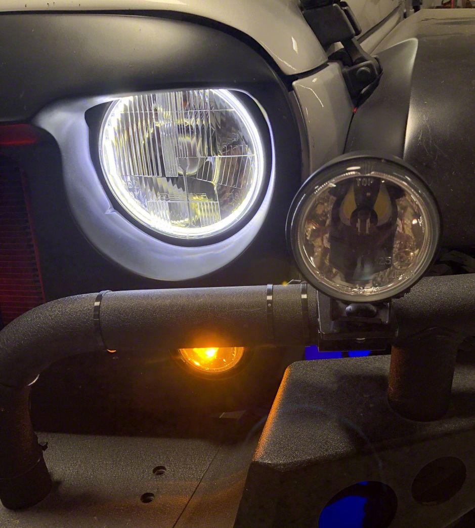 Stylish and Bold Illumination. These Switchback Halo LED Headlights powerfully illuminate the road with a bright, focused beam that significantly improves your night visibility. The prismatic glass optics with Photometric Reflective Technology amplifies light output by 20%. Moreover, the integrated halos and LED turn signals stylishly enhance your Wrangler’s lighting while elevating its all-terrain presence.