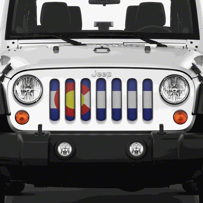 Protective Styling. Keeping your Jeep’s radiator clean and in good working order is hard without a good grille insert. The Colorado State Flag Grille Insert can be a great addition to your Wrangler if you want better performance and a unique look. This Dirty Acres insert is stylish and colorful, and will maintain proper engine airflow while minimizing the volume of dust particles that can overheat the radiator.