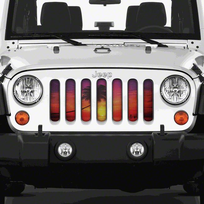 Add Some Style to Your Jeep's Front End. Are you looking to spruce up the exterior appearance of your Wrangler? Consider installing a premium grille insert, available in various prints to match your style. This Sunset Beach printed Grille Insert is an excellent addition to any Wrangler, bringing some tropical flavor to your everyday commute! Whether you're from a tropical area or simply love to vacation, this Grille Insert is a premium, easy-to-install addition to spruce up your Jeep.
