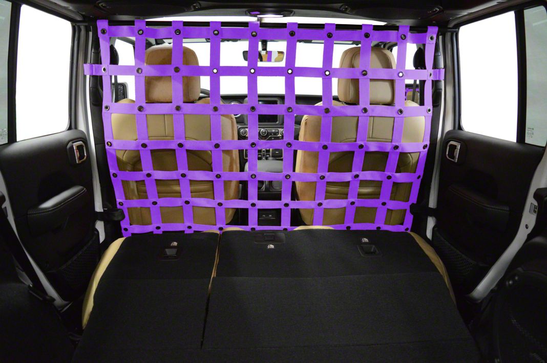 Protect Your Front Seats. Prevent your front seats from being overrun by your friendly dog with the top-grade Dirty Dog 4x4 Cargo/Pet Divider - Purple. In a striking purple finish, it restrains your dog to the rear cargo area of your wrangler using premium quality polypropylene webbing accents from top to bottom with reinforced black anodized grommets.