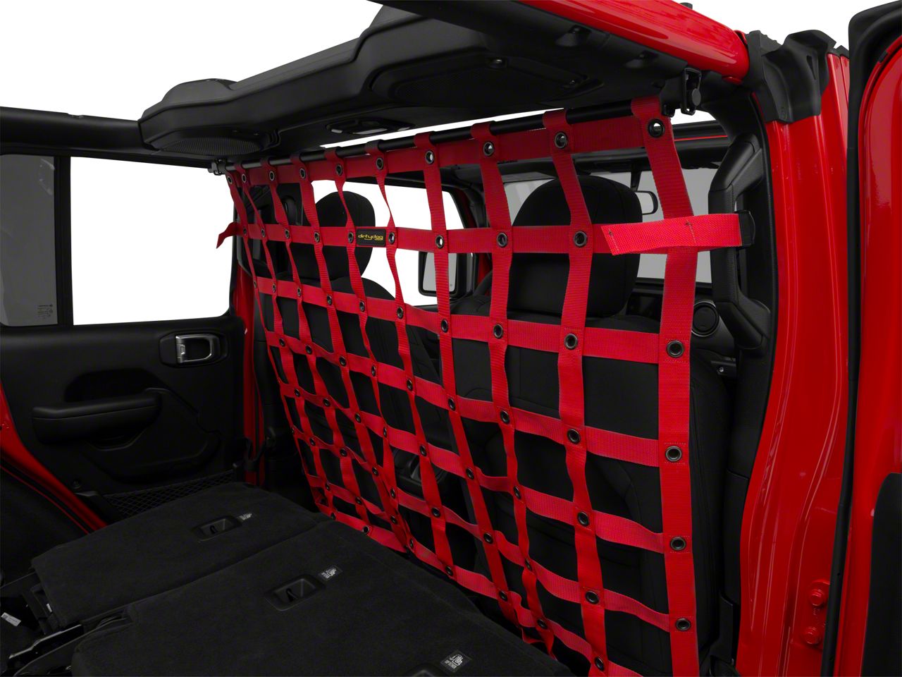 Customized Design. Dirty Dog's Red 4x4 Cargo/Pet Divider is the perfect customized addition to your 2018-2023 Jeep Wrangler JL as it features a design that stretches from the roll bar to the floor, adding maximum coverage whether the rear seats are up or down. An imperative product if you plan on traveling with your pet, this divider is made to help your pet enjoy the ride outside of their crate without distracting you from the road ahead by climbing into the front seat. The divider also works with cargo and other gear, keeping it securely in the rear of the Jeep while you tackle the most challenging terrain out there.