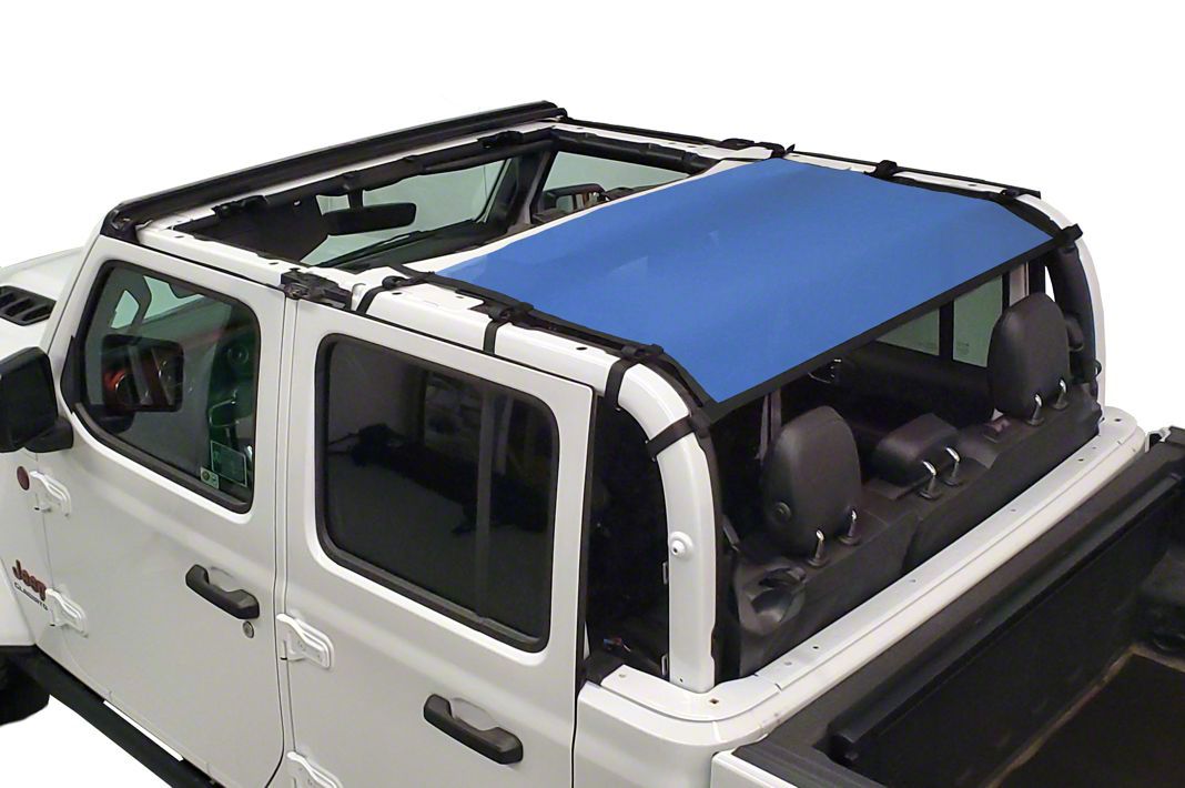 Sun-Protected, Open-Air Driving. Take advantage of the sunny weather and transform your Jeep Gladiator for a more adventurous off-road experience. Use this Dirty Dog 4x4 Blue Rear Sun Screen for a sun-protected, open-air mode while giving your JT an enhanced style. It also covers the rear seat area and provides you with enough protection from the harmful sun rays. For ultimate convenience and versatility, this mesh cover also works perfectly well with your factory tops.