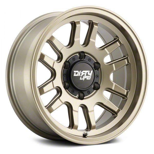This 17x9 Dirty Life Canyon Satin Gold 5-Lug Wheel is completed in a high-quality finish that will make your wheel the envy of everyone. There's a durable clear coat to ward off driving hazards.