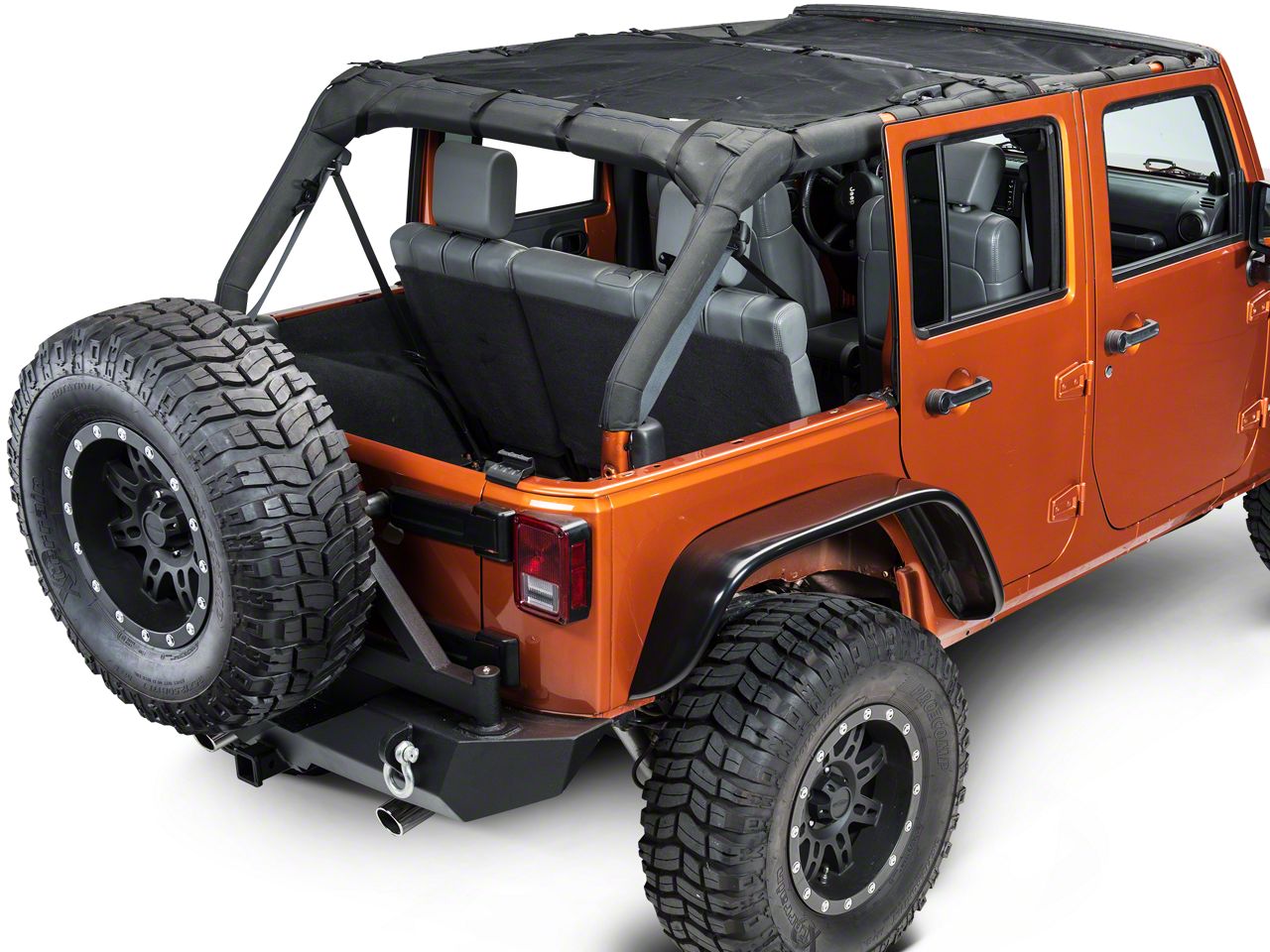 Block Out the Sun. When you want to protect yourself and your rear passengers from the sun above, choose the Dirty Dog 4x4 Front & Rear Sun Screen. This kit comes with a front sun screen and a rear sun screen to ensure that everyone can enjoy the fresh air outside without a sunburn to follow. The mesh allows for UV filtration and comes in black for your 2007-2017 JK 4-Door. You can retain the rugged look of your Jeep with this sun screen installed.