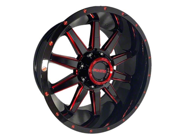 Disaster Offroad D04 Gloss Black with Candy Red Milled 6-Lug Wheel; 20x10; -12mm Offset. The Disaster Offroad D04 Gloss Black with Candy Red Milled 6-Lug Wheel; 20x10; -12mm Offset features a sleek and modern design that enhances the overall aesthetic of any vehicle. Its brushed gunmetal finish adds a touch of sophistication and complements various vehicle styles. This wheel's premium construction ensures durability and a robust appearance.