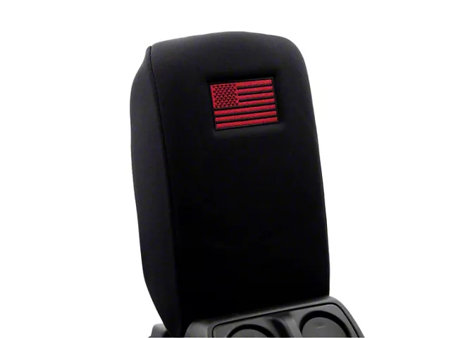 Construction and Appearance. Featuring a matte black finish, this console cover is crafted with attention to detail and proudly made in the USA. The embroidered American flag logo adds a patriotic touch, while the durable material ensures long-lasting performance. Multiple finish options give drivers flexibility to match their personal style.
