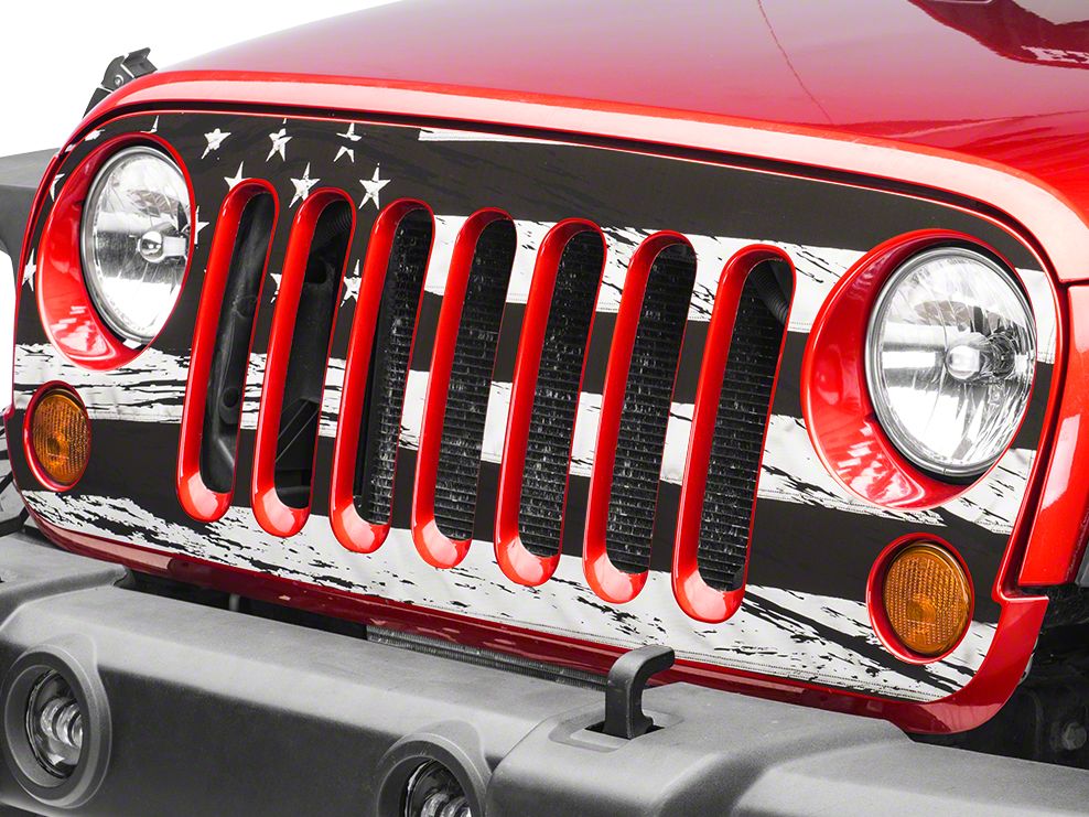 Patriotic Styling. Add patriotic styling to your 2007-2018 JK with a Black and White Distressed American Flag Grille Decal from SEC10. Designed to apply over your Wranglers front grille fascia, this vinyl grille decal not only looks great, but is an excellent way to cover up any existing scuffs and scratches you may have earned out on the trail.