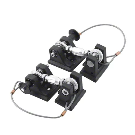 Design. These hood hold downs have a quick-release push pin that lets you open the hood easily. The pin is attached to a steel lanyard to keep it from misplacing.