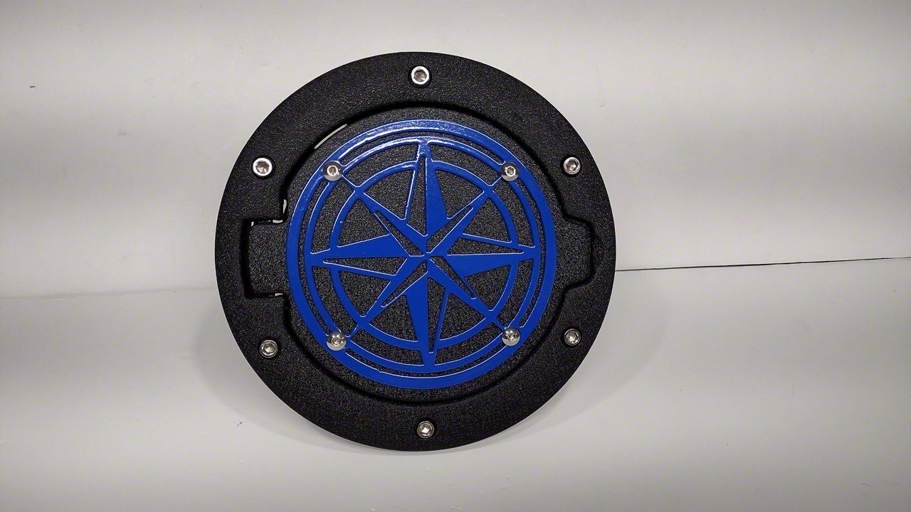 Construction and Appearance. Manufactured from premium-grade die-cast aluminum alloy material, this fuel door is built for durability and strength. It features a blue powder-coat finish that provides excellent resistance to corrosion and rust. The integrated ABS plastic mounting cup ensures secure and reliable attachment.