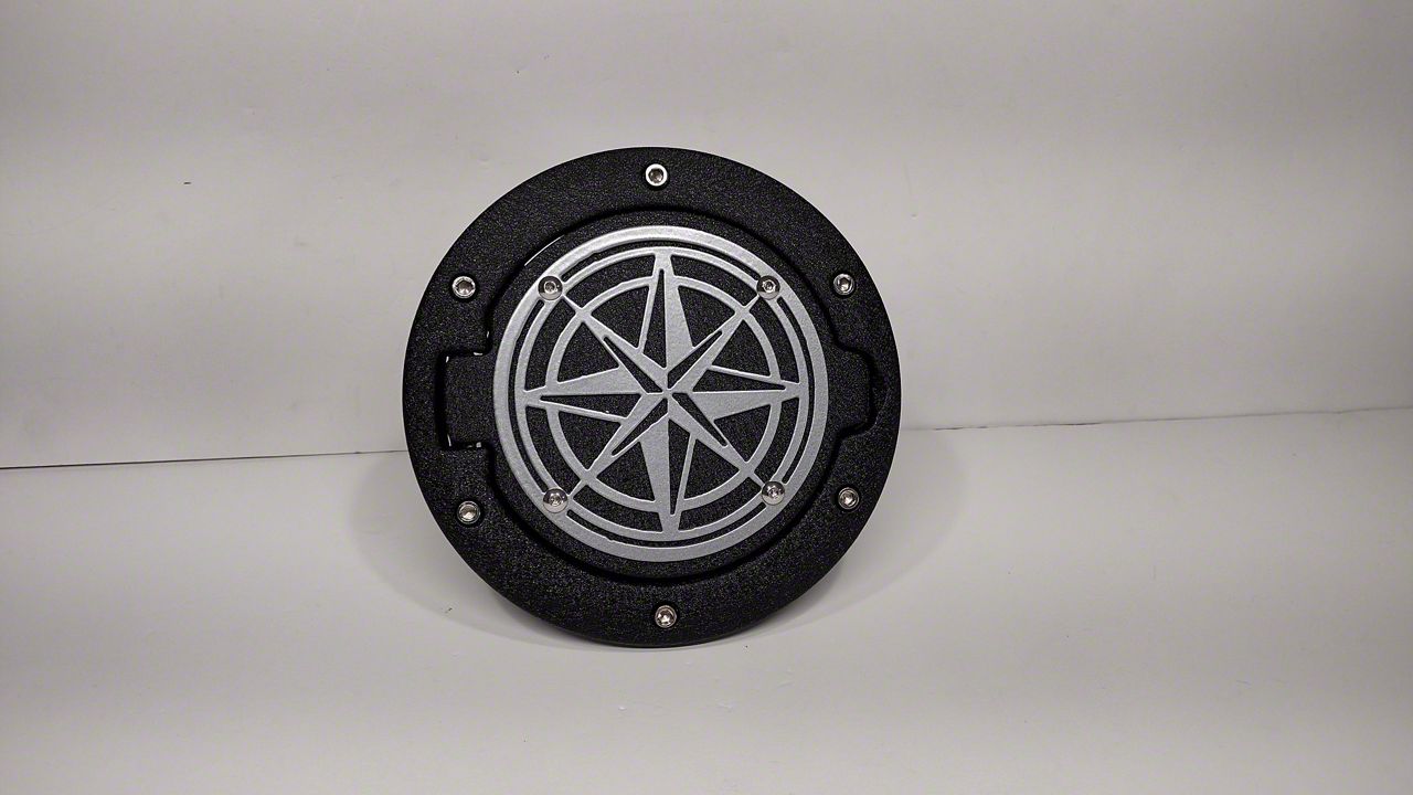 Aggressive Accessory. The Drop Zone Off Road Compass Fuel Door in silver is a stylish and functional upgrade for Jeep Wrangler owners. Made from high-quality materials, it is durable and easy to install. The compass design adds a unique touch to your Jeep's exterior and serves as a helpful reference for off-road navigation.