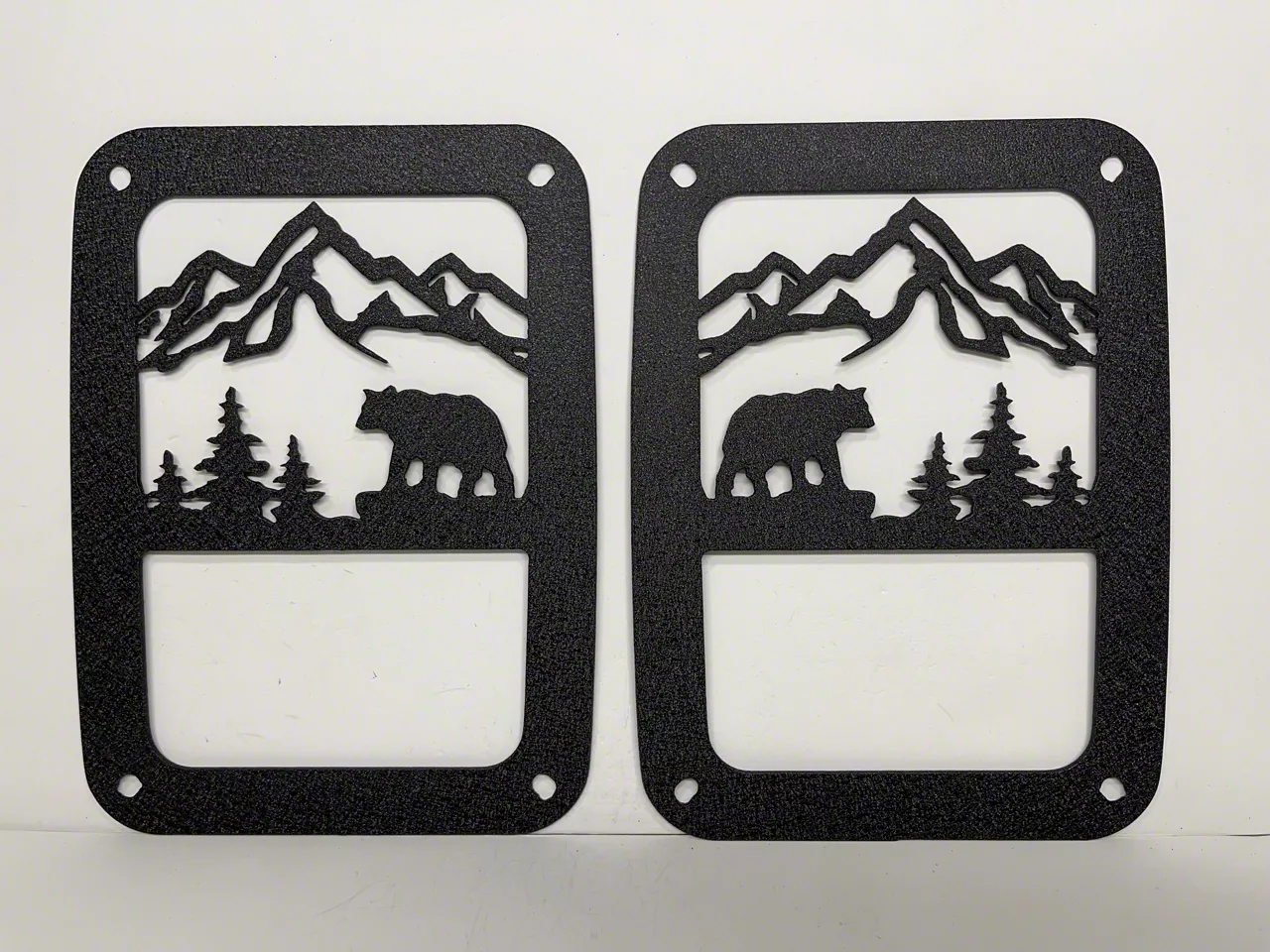 Application. The Drop Zone Off Road Tail Light Guards; Bear Mountain Scene fits 2007-2018 Jeep Wrangler JK models.