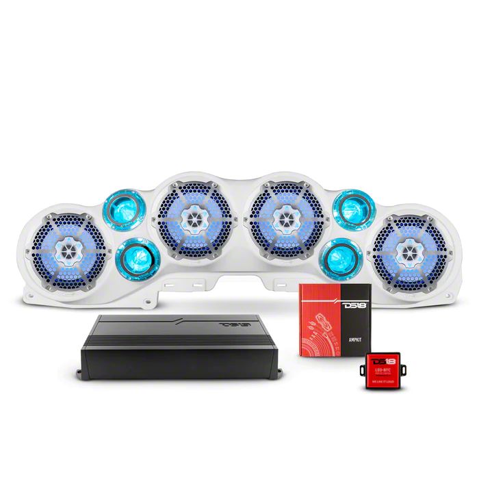 Enhanced Audio Experience. The DS18 Complete RGB Loaded Sound Bar Package is designed to elevate your audio experience in the 2020-2023 Jeep Gladiator JT models. This package includes metal grille marine speakers, an amplifier and amp kit, and a LED module, delivering superior sound quality and vibrant lighting effects. The sound bar and speakers come in a clean white finish, adding a stylish and modern touch to your vehicle's interior. The water-resistant design ensures durability and performance even in challenging conditions.