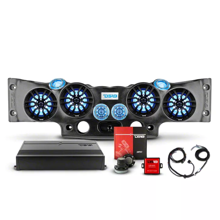 Quality Audio Quality. Upgrade your Jeep Wrangler JK's audio experience with the DS18 Complete RGB Loaded Sound Bar Package with Plastic Grille Marine Speakers; Black Sound Bar with Black Speaker Grilles. This premium audio package is specifically designed to enhance your off-road adventures, providing crystal-clear sound quality in any environment.