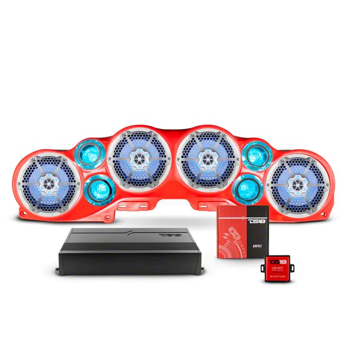 Dynamic Marine-Grade Sound Solution. The DS18 Complete RGB Loaded Sound Bar Package with Metal Grille Marine Speakers (Red Sound Bar with White Speakers) combines high-performance audio with aesthetic LED lighting. This package is designed for Jeep Wrangler JK models and delivers superior sound clarity, making it ideal for marine and off-road use.