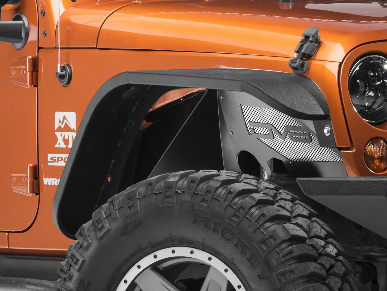 Application. DV8 Offroad’s Aluminum Inner Fender Flares in black are engineered for a perfect fit when installed on 2007-2018 Jeep Wrangler JKs. Choose from front only, rear only or front and rear inner fenders when ordering.