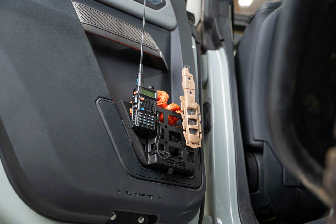 Enhanced Storage Solution. The DV8 Offroad Rear Door Pocket MOLLE Panels provide an upgraded storage option for the rear seating area, replacing sagging factory door nets. These panels are designed to hold their shape while offering MOLLE mounting capabilities, allowing users to securely attach small tools, pouches, and kits. Their unique design also accommodates larger items such as water bottles or coffee thermoses, making organization and accessibility easier during travel or off-road adventures.