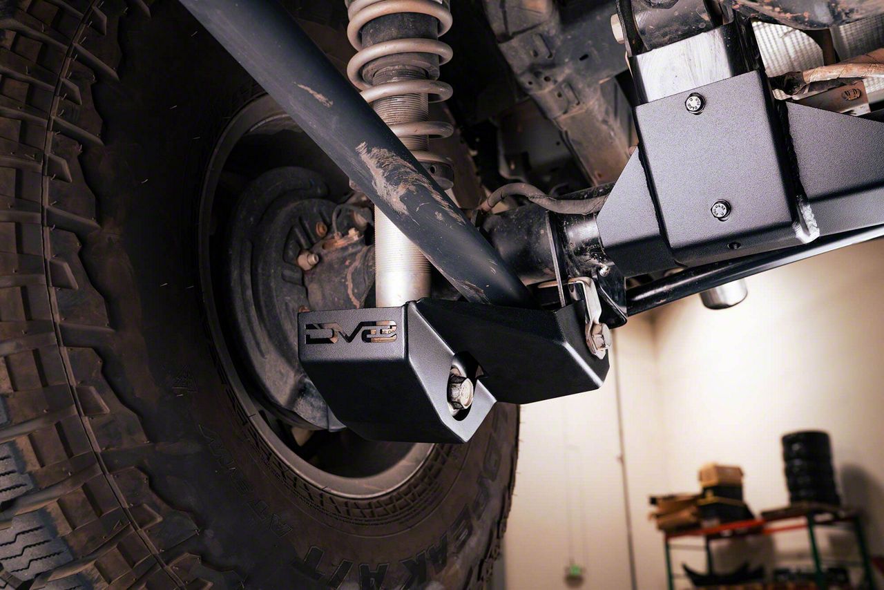 Top-Tier Steelwork. The DV8 Offroad Rear Shock Guard Skid Plates are made of high-quality aluminum that can endure impact from dirt and rubble, and they're painted with an anodized black finish to give strength and rust resistance to the components.