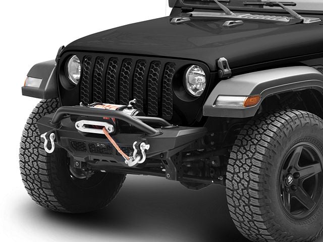 The bull bar protects against light brush and can mount up to a 15-inch light bar above or below the bar if not running a winch. A 20-inch light bar can be mounted behind the satin black mesh plate in the middle of the bumper. A pair of up to 4-inch round lights can be mounted on the top plate of the bumper for even more lighting options. Pictured in the gallery are amber Baja Designs LP4 round lights. Installation is a direct fit, bolt-on process that we detail in our step-by-step install guide. Equipped with everything you need to take your off-roading game to the next level and built with style in mind, upgrade today with the Spec Series Jeep Winch Front Bumper.