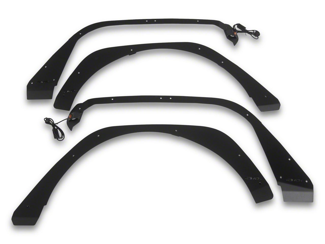 Construction and Appearance. Crafted from premium-grade laser-cut 3/16-inch steel, these fender deletes feature a durable textured powder-coated finish. The construction ensures long-lasting strength and resistance to off-road conditions while maintaining a rugged appearance.