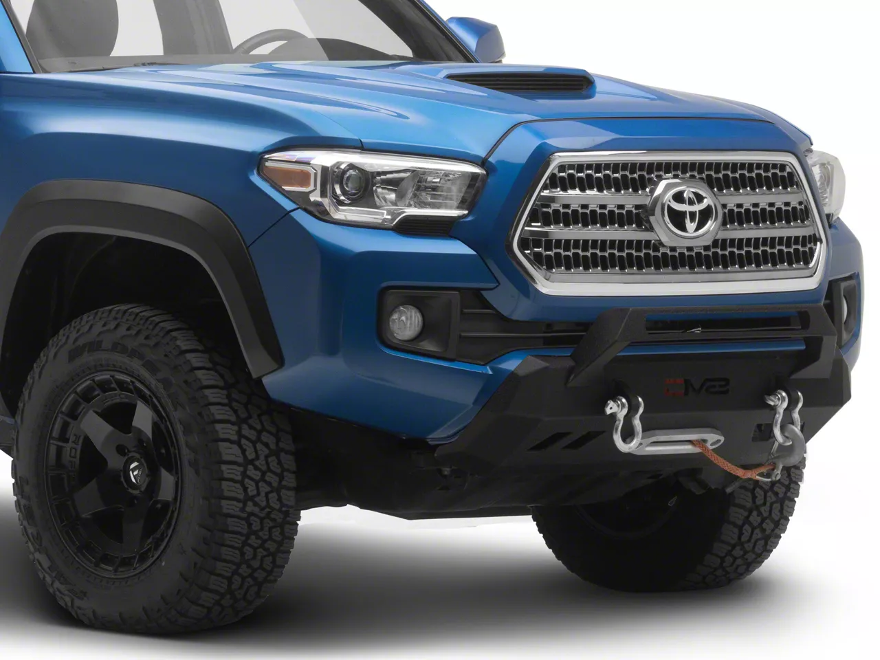 Rugged Utility Front Protection. The DV8 Offroad Center Mount Winch Capable Front Bumper V2 offers reinforced protection, off-road functionality, and modular lighting capabilities for your Tacoma. This bumper includes a heavy-duty winch mount compatible with most standard-size winches and is equipped with D-ring mounts for dependable recovery support. The included bolt-on bull bar accommodates a 20-inch LED light bar, enhancing visibility on rugged terrain while providing grille protection from debris and obstacles.