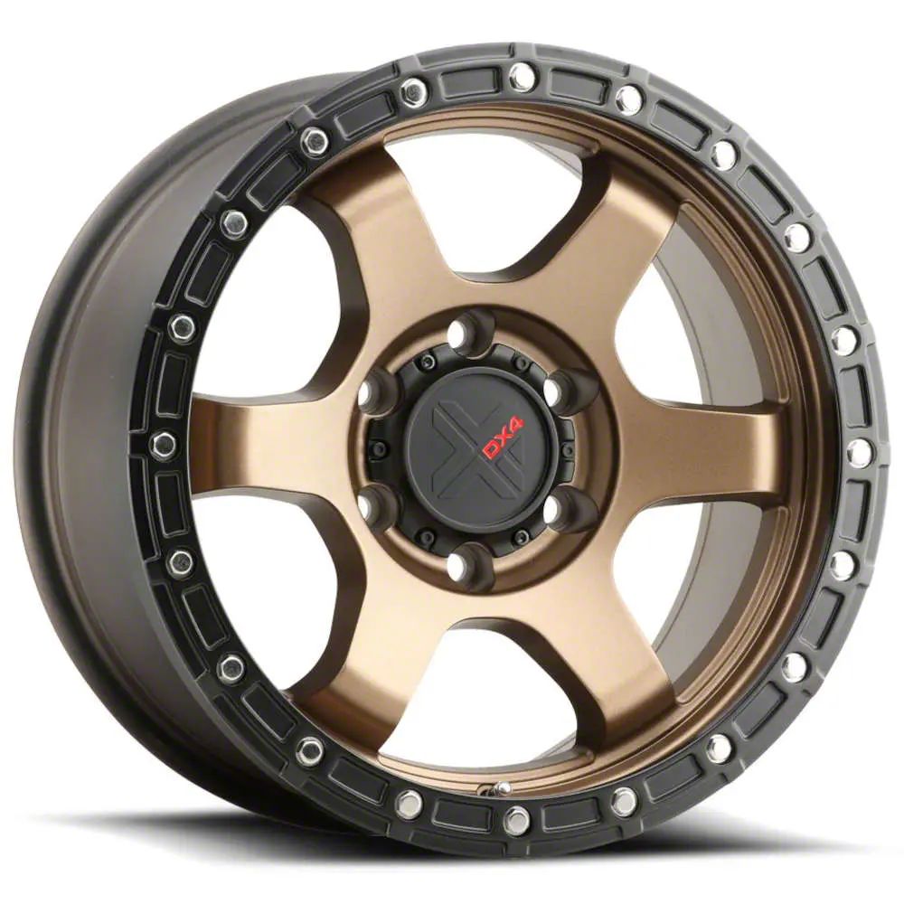 DX4 Wheels NITRO Frozen Bronze with Black Lip 6-Lug Wheel; 16x8 exudes an aesthetic allure that complements a range of vehicle styles. With its design rooted in DX4 Wheels craftsmanship, this wheel accentuates your vehicle's elegant stance.