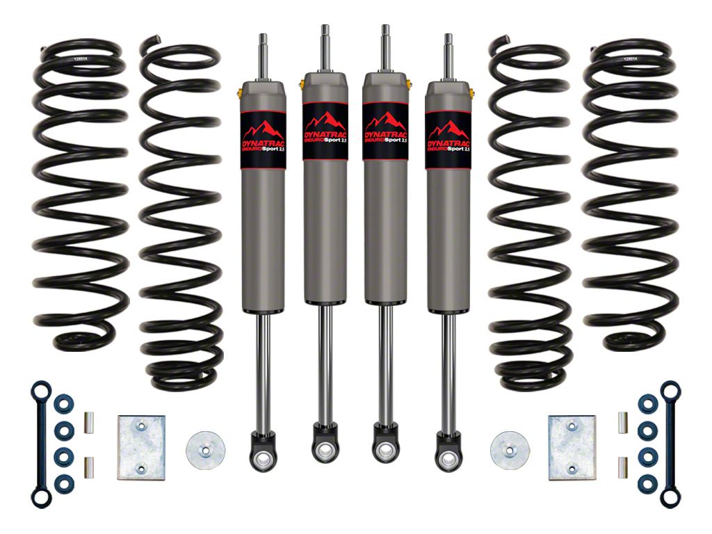 Construction and Appearance. The system features dual rate progressive wound coil springs in the front and rear, combined with Dynatrac's 2.5 EnduroSport shocks that are rebuildable and re-valvable for long-lasting performance. All components utilize aircraft-grade materials for durability and precision, with OE-style mounting for seamless integration. The finish is designed for toughness and corrosion resistance in rugged environments.