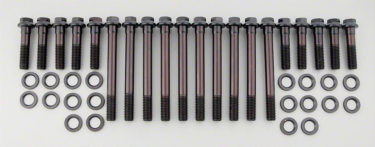 The Edelbrock #8577 bolt kit contain a complete set of the highest quality head bolts and hardened washers available. Cold-formed to ensure molecular integrity and heat treated prior to thread rolling and machining. Reduced diameter bolt heads eliminate the need for valve train removal to facilitate cylinder head re-torqueing. Hardened and parallel-ground washers are included. Rated at 170,000 p.s.i.