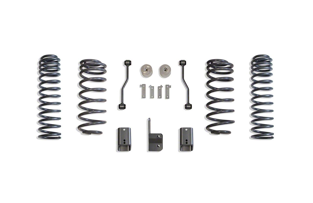 Construction and Appearance. This kit features high-quality 3-inch front and 2-inch rear coil springs, rear sway bar end links, and bump stop extensions for durability and enhanced performance. The included rear track bar relocation and brake line drop brackets ensure proper alignment and reliable function.