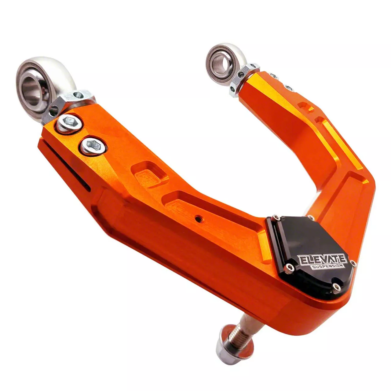High-Quality Upgrade. The Elevate Suspension Billet Uniball Upper Control Arms is a pair of premium solutions designed to enhance your vehicle's performance. Featuring better angularity, these control arms allow for increased wheel travel, enabling a smoother ride even in challenging terrains. They also facilitate proper alignment, promoting optimal handling and tire wear. With improved coil spring clearance at full droop, these control arms prevent any interference, ensuring seamless suspension movement.